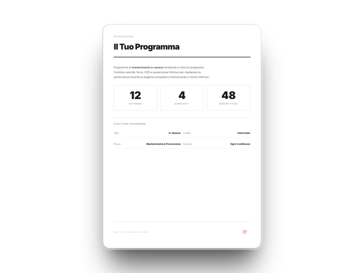 Scarica una settimana di esempio gratuita. Scopri la struttura delle sessioni in palestra e sul campo, i protocolli di prevenzione e come si integrano con lo schedule delle partite prima di acquistare.