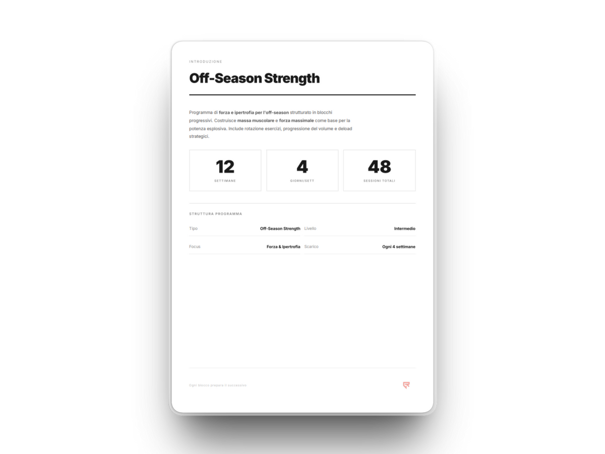 12 settimane su split Upper/Lower con 4 sessioni a settimana. 3 blocchi periodizzati — dall'ipertrofia base alla forza massimale. Il programma off-season per costruire massa muscolare e forza che si trasferiscono sul campo.