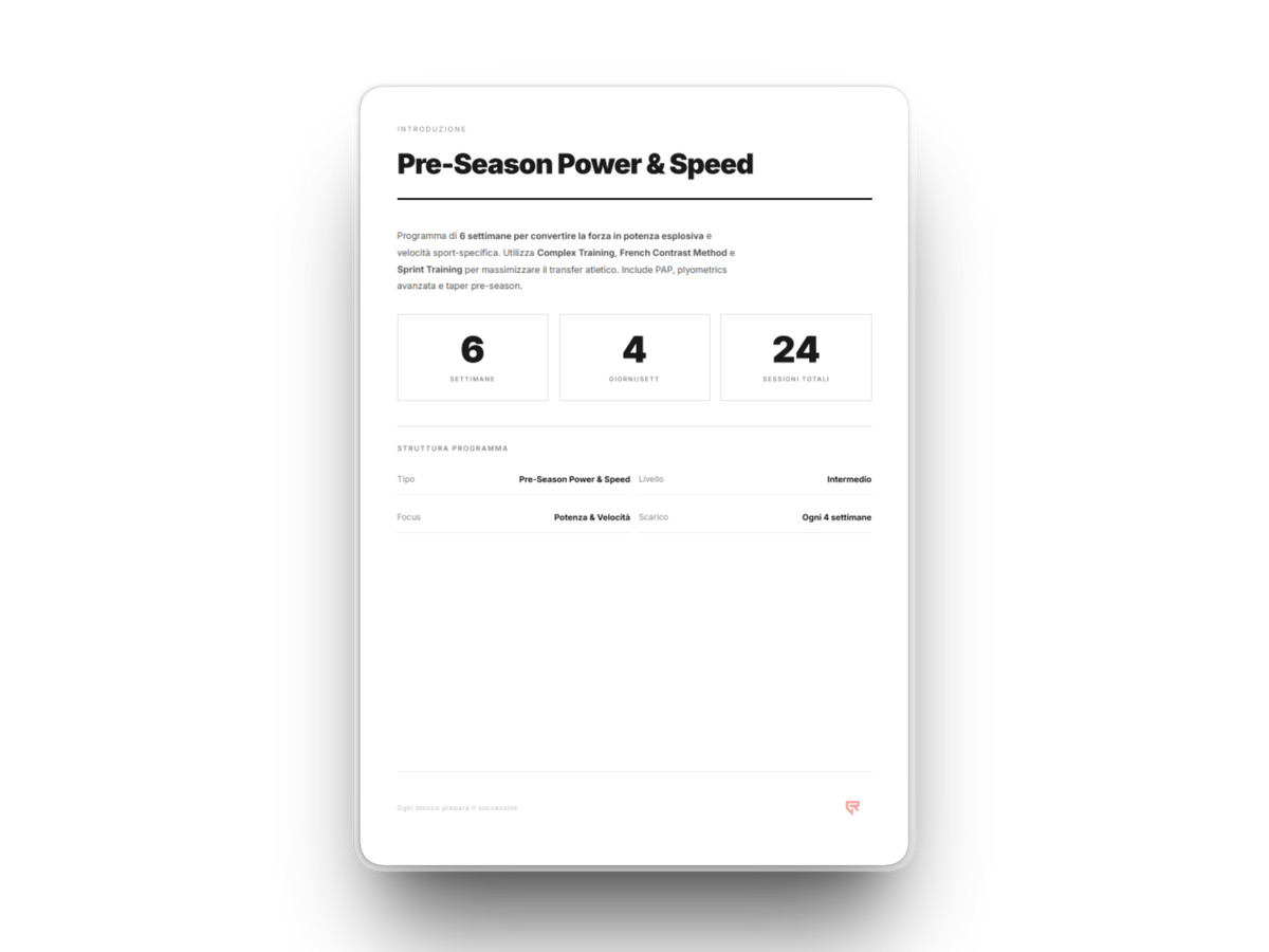 6 settimane di preparazione pre-season con split Complex e French Contrast. 4 sessioni a settimana, 3 blocchi progressivi — dalla costruzione della potenza di base fino all'espressione massima di velocita e reattivita. Arriva in campo piu esplosivo, piu veloce, piu pronto.