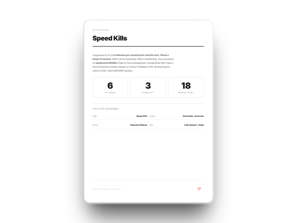 6 settimane di programmazione per sviluppare velocita neuromuscolare, coordinazione e pattern motori veloci applicati al combattimento. 3 blocchi progressivi dall'accumulo al picco di performance.