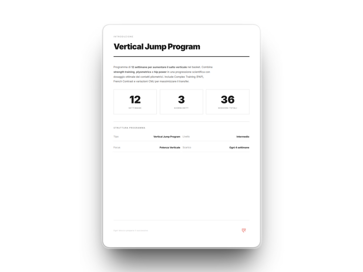 12 settimane per aumentare il salto verticale con 3 sessioni a settimana. Strength, Plyo e Hip Power in 3 blocchi progressivi — dalla costruzione della forza base alla potenza reattiva massima. Il programma scientifico per saltare piu in alto in campo.